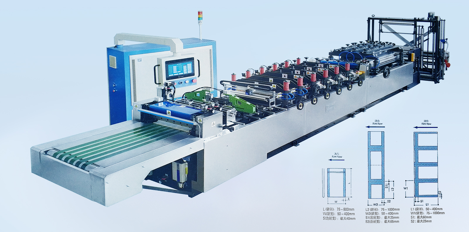 材料:各種復合薄膜。 卷筒:寬度≤850mm,直徑≤600mm。制袋速度:150段/分(機械設計速度)約<30m/min。 制袋寬度:≤400m。制袋長度:50-400mm(超長時可采用倍送裝置),程序設置320mm以上自動轉換成倍送。
